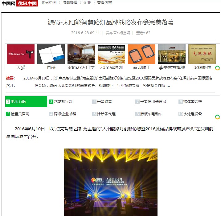 繼源碼在深圳成功舉行太陽能路燈創新論壇暨源碼2016品牌戰略發布會后,引起了各大媒體和行業的廣泛關注,行業專家柴鈺教授表示,此次源碼發布會已經顛覆了行業對傳統太陽能路燈的認知,對太陽能路燈行業的發展指明了方向。在各大媒體的爭相報道下,網上掀起一片關于“源碼”的信息狂潮。