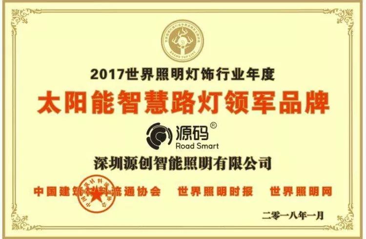 源碼榮獲“太陽(yáng)能智慧路燈領(lǐng)軍品牌”榮譽(yù)