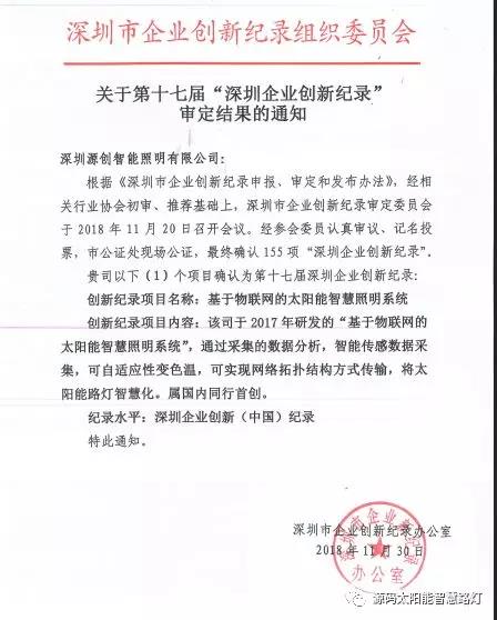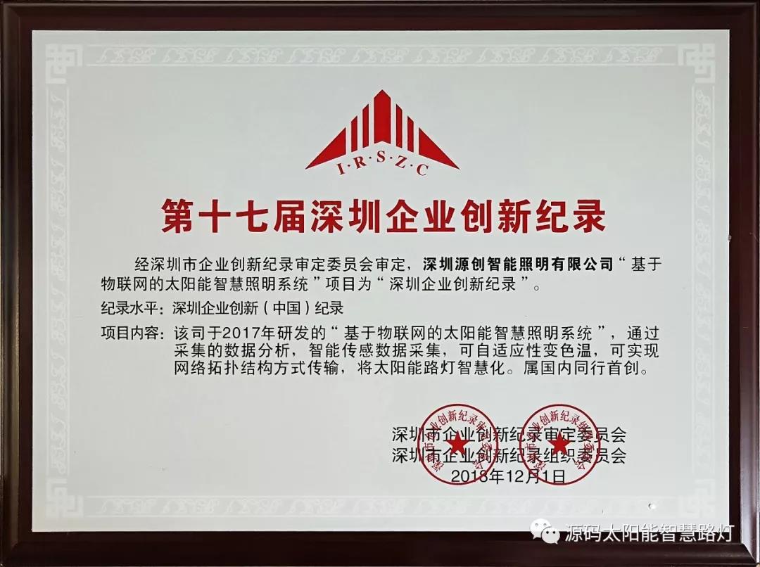 其中深圳源創(chuàng)智能照明有限公司(以下簡稱“源碼太陽能路燈”),憑借在太陽能路燈創(chuàng)新技術(shù)的突出優(yōu)勢獲得“深圳企業(yè)創(chuàng)新(中國)紀錄”獎。該記錄將物聯(lián)網(wǎng)技術(shù)運用于太陽能路燈,有效地解決路燈的管理、維護問題,賦予太陽能路燈”智慧“屬性,在行業(yè)內(nèi)屬領(lǐng)先水平,屬國內(nèi)同行首創(chuàng)。