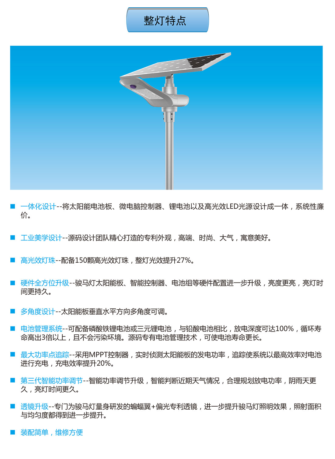 駿馬燈屬于中高端定位的中大功率太陽能智慧路燈,被廣泛應用于城市或鄉鎮主干道或次干道,以及工業園區、廣場等場景。